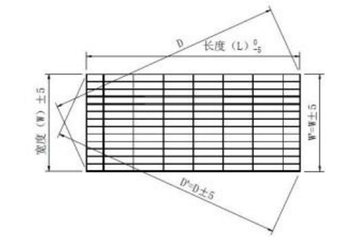 8 對(duì)角線偏差:鋼格柵板由于其尺寸公差而引起的對(duì)角線偏差,不應(yīng)大于±5mm,如下圖所示的對(duì)角線偏差。