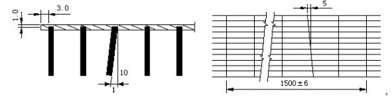 5 橫桿偏斜及間距偏差:橫桿邊緣對(duì)鋼格板中心的偏斜應(yīng)不大于5mm,在任意1500mm長(zhǎng)度內(nèi),兩端橫桿的間距偏差允許±6mm